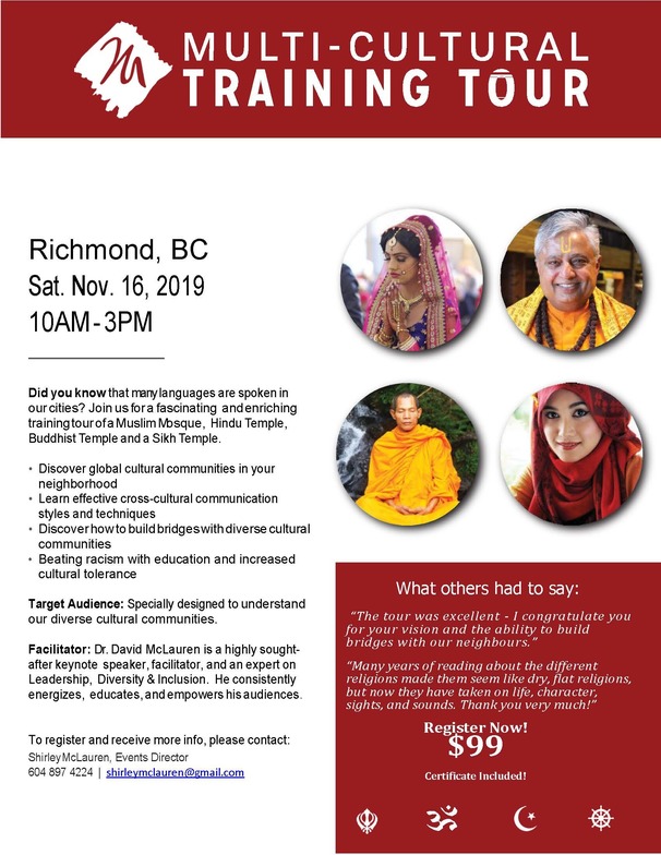 This is an invitation for individuals and groups to experience a multi-cultural training tour. The November 16 tour will take place in Richmond.