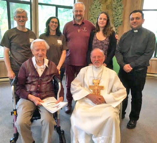 Pictured left to right (back row) are Andrew Twiddy (SSF Companion), Christine Muise (SSF Companion), Jonathan LLoyd TSSF, Sarah LLoyd (daughter of Jonathan, living in New Zealand), and Ayoob Adwar (former monk and now Anglican priest). In the front are Bishop Remy de Roo and Archbishop Andrew Hutchison.