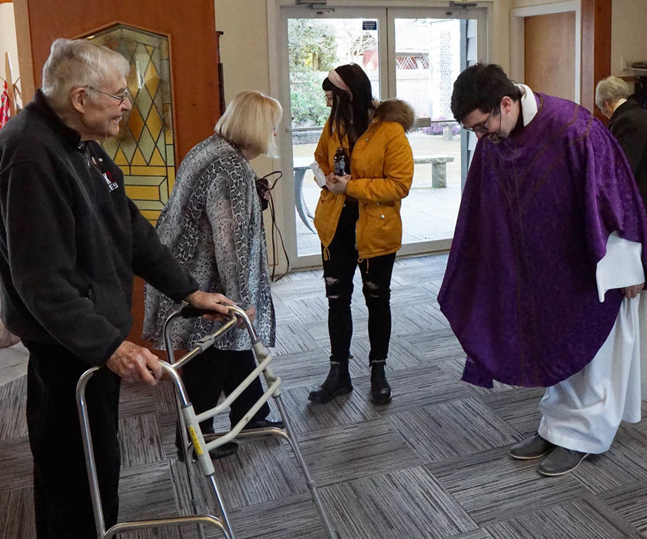 Following worship, Rev. Gutjahr processed out to the narthex entrance and greeted the parish with a variety of greetings, limiting physical contact. There was one cautious, but good-humoured “single elbow-bump” administered by Trevor Mills.