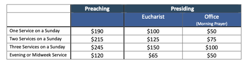 The structure of clergy supply rates has changed for 2026. Preaching and presiding have been separated in order to reflect the different levels of preparation required for different functions in the liturgy. Furthermore, a distinction between Eucharistic liturgies and Office services (generally Morning Prayer) has been introduced.